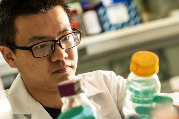 Image: Rice University graduate student Danning Zhang, who led the development of a particle that attracts and degrades contaminants in water, checks a sample in a Rice environmental lab. (Credit: Jeff Fitlow/Rice University)