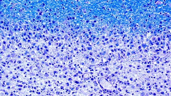 Image: Diminishing myelin sheaths: The damaged areas (at the bottom of the image) of the brains of MS patients lack myelin (at the top, in blue). (Image: Dr. med. Imke Metz, University of Göttingen, Germany) (Credit: Dr. med. Imke Metz, University of Göttingen, Germany)