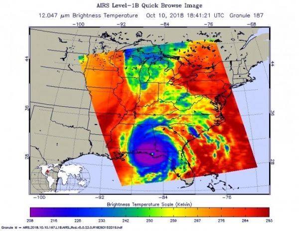 Image: On Oct. 10 at 2:41 p.m. EDT (1841 UTC) the AIRS instrument aboard NASA's Aqua satellite provided an infrared view of Hurricane Michael after landfall. The AIRS image showed that Michael still maintained a clear eye, and was surrounded by a large symmetric area of powerful thunderstorms. (Credit: NASA JPL, Heidar Thrastarson)