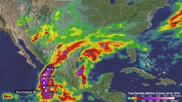 At NASA’s Goddard Space Flight Center in Greenbelt, Maryland a rainfall accumulation analysis was generated by totaling Integrated Multi-satellitE Retrievals for GPM (IMERG) data for the period from October 20 to 26, 2018. The IMERG rainfall accumulation data indicated that Willa produced rainfall totals greater than 20 inches (508 mm) in the Pacific Ocean off Mexico’s coast. IMERG data also indicated that rainfall accumulations of over 15 inches (381 mm) occurred in parts of Mexico and Southeastern Texas.