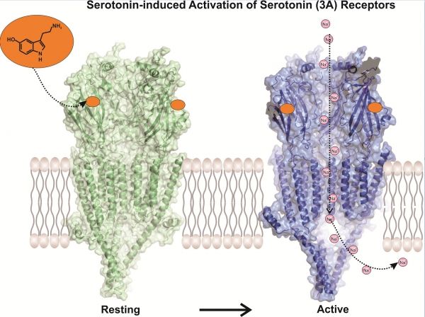 Image: Serotonin-induced activation of serotonin (3A) receptors. CREDIT: Case Western Reserve University
