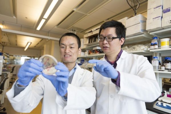 Image: Assistant professor Zhaokang Cheng and postdoctoral fellow and co-author Peng Xia examine bacterial cultures used to grow genes of interest to their research, such as the CDK2 gene. The genes are then isolated and introduced into cardiac muscle cells to study their function. (Credit: Photo by Cori Kogan, Washington State University Health Sciences Spokane)