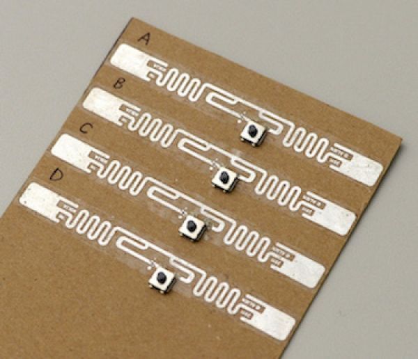 Image: An RFID tag is modified by cutting out a small part its antenna (silver ribbon) and placing a small push-button switch on it. If several modified tags are mounted on a surface, they can act as a wireless keypad. CREDIT: University of Waterloo
