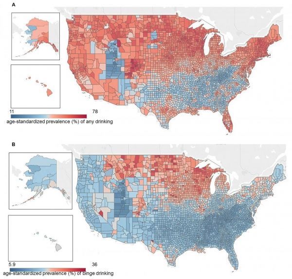 Image: This is the incidence of all (top) and binge (bottom) drinking across counties of the United States. (Credit: Ventura Cots et al. (2018). Hepatology, doi: 10.1002/hep.30315. Copyright John Wiley and Sons.)