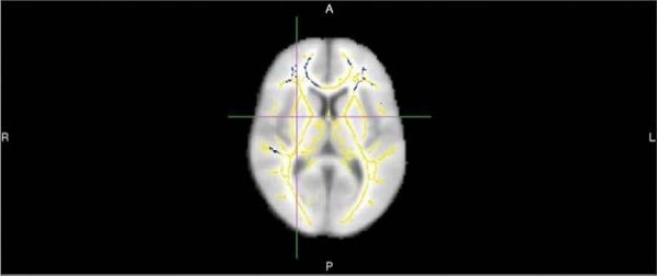 Image: This image shows areas of reduced fractional anisotropy -- a diffusion MR imaging marker of white matter damage -- in 20 persons who develop Alzheimer's dementia compared to 20 who remain cognitively normal. These areas show up as blue-colored voxel overlaid onto a white matter skeleton (yellow colors) overlaid onto a standard template brain. (Credit: Radiological Society of North America)