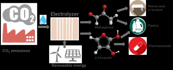 Image: This image shows how carbon dioxide can be electrochemically converted into valuable polymer and drug precursors. (Credit: Karin Calvinho/Rutgers University-New Brunswick)