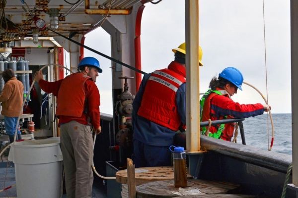 Image: Study authors Ben Twining and Natalie Cohen collect water samples in order to study the phytoplankton communities within. The researchers found that iron storage strategies may determine which phytoplankton species thrive in changing oceans and impact marine food webs. (Credit: Ben Twining, Bigelow Laboratory for Ocean Sciences)