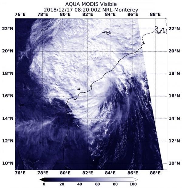 Image: On Dec. 17 at 3:20 a.m. EST (0820 UTC) the MODIS instrument aboard NASA's Aqua satellite looked at Tropical Depression Phethai after it made landfall south of Visakhapatnam in southeastern India. (Credit: NASA/NRL)