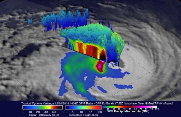 On December 20, 2018, NASA’s Global Precipitation Measurement mission or GPM core observatory satellite passed over the Tropical Cyclone Kenanga and captured the storm beginning to weaken as predicted. The GPM satellite had an excellent view of the Kenanga when the tropical cyclone’s maximum sustained winds were at 90 knots (103.5 mph). GPM’s pass showed the eye of the storm, visible the day before, had since filled in.