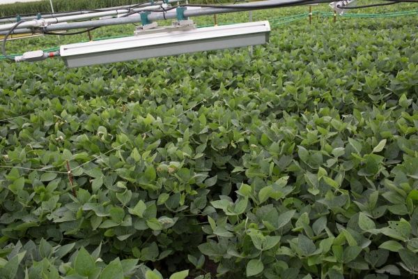 Image: Soybeans grow under heaters used to mimic futuristic conditions. Their seeds suggest that rising temperatures may actually improve nutrition but decrease yields, according to a new study. (Credit: Claire Benjamin/RIPE Project)