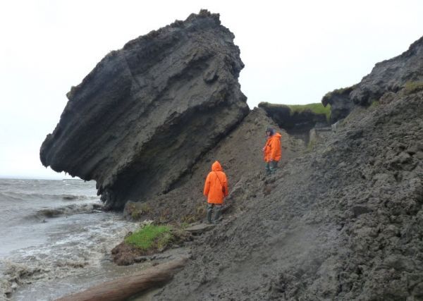 Photo: AWI permafrost scientists investigate the eroding coastline at the Siberian island Sobo-Sise, Eastern Lena delta. CREDIT: Guido Grosse