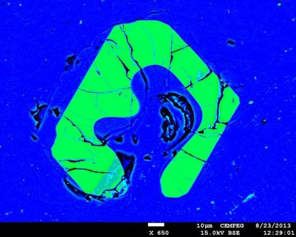 Image: This is a false color electron-microscope image of a resorbed apatite crystal (green) in pitchstone glass (blue). The composition of the pitchstone glass and the characteristic mineral textures are identical in the studied pitchstone sites of the Sgùrr of Eigg and Òigh-sgeir, although over 30km apart, indicating a common origin, and thus a large and geographically widespread volcanic eruption. (Credit: Valentin Troll)