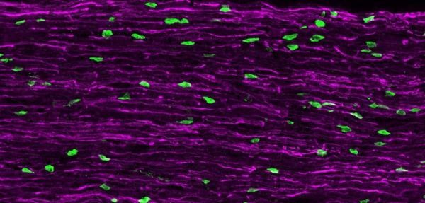 Image: Natural Killer cells invading a damaged nerve. (Credit: Alexander Davies)