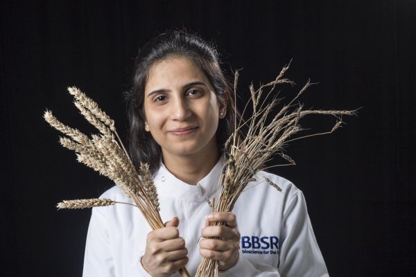 Image: John Innes Centre researcher Dr. Sanu Arora with domesticated wheat one of its wild relatives. (Credit: Andrew Davis)