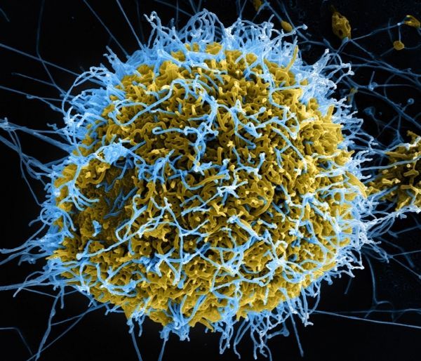Image: Colorized scanning electron micrograph of filamentous Ebola virus particles (blue) budding from a chronically infected VERO E6 cell (yellow-green). Credit: National Institute of Allergy and Infectious Diseases, National Institutes of Health