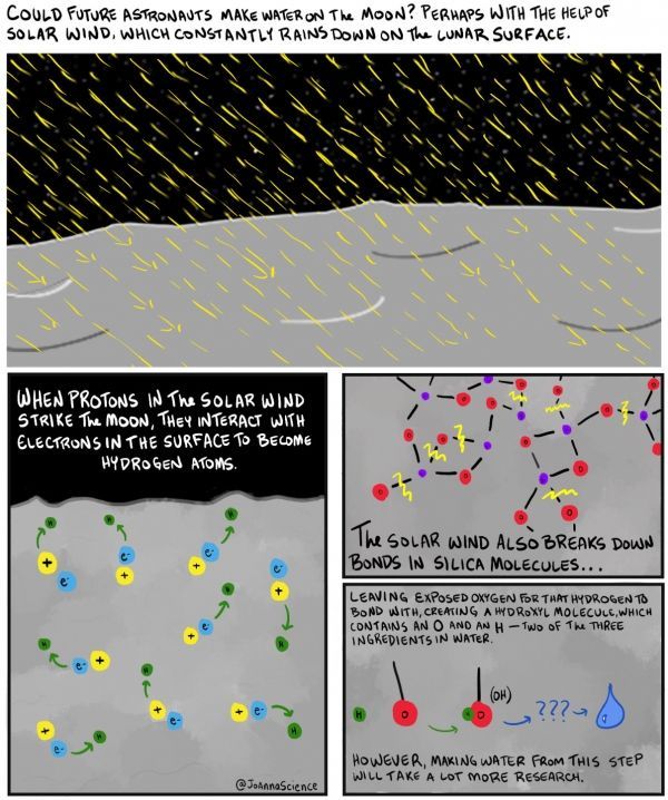 Using a computer program, scientists simulated the chemistry that unfolds when the solar wind pelts the Moon’s surface. As the Sun streams protons to the Moon, they found, those particles interact with electrons in the lunar surface, making hydrogen (H) atoms. These atoms then migrate through the surface and latch onto the abundant oxygen (O) atoms bound in the silica (SiO2) and other oxygen-bearing molecules that make up the lunar soil, or regolith. Together, hydrogen and oxygen make the molecule hydroxyl (OH), a component of water, or H2O.