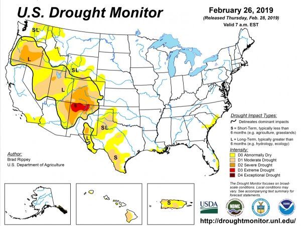 According to the February 26, 2019, U.S. Drought Monitor, moderate to exceptional drought covers 10.7% of the United States, a decrease from last week’s 13.1%. The worst drought categories (extreme to exceptional drought) decreased from 1.1% last week to 0.5%.