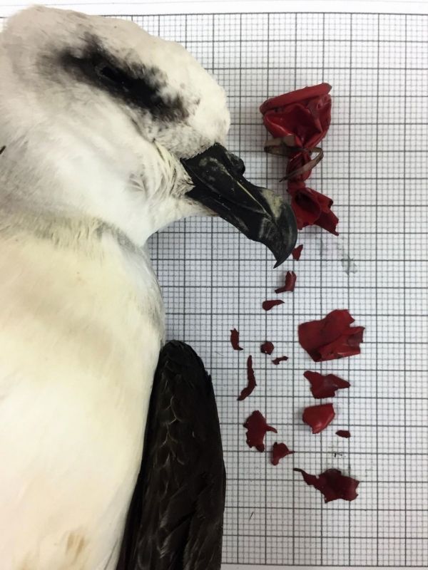 Photo: Autopsy of a white-headed petrel, with balloon debris. CREDIT: Lauren Roman