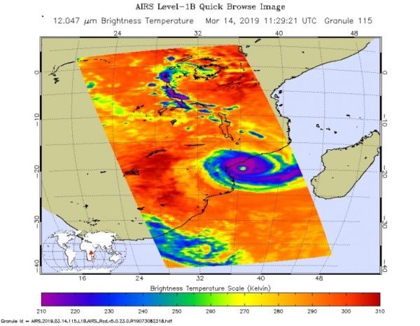 Image: On the March 14, the AIRS instrument aboard NASA’s Aqua satellite analyzed cloud top temperatures of Tropical Cyclone Idai in infrared light. AIRS found cloud top temperatures of strongest thunderstorms were as cold as or colder than minus 63 degrees Fahrenheit (minus 53 degrees Celsius) around the eye. CREDIT: NASA JPL / Heidar Thrastarson
