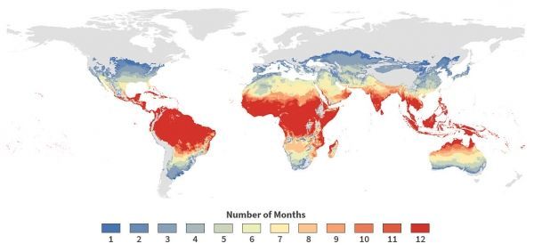 Image: Current worldwide distribution of the mosquito Aaedes aegypti – which can spread dengue fever, Zika virus, chikunyunga and yellow fever – by duration of time in each region. (Image credit: Sadie Ryan)