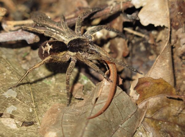 Photo: A wandering spider (Ctenidae) preying on a subadult Cercosaura eigenmanni lizard. Photo by Mark Cowan, in Amphibian & Reptile Conservation (amphibian-reptile-conservation.org)
