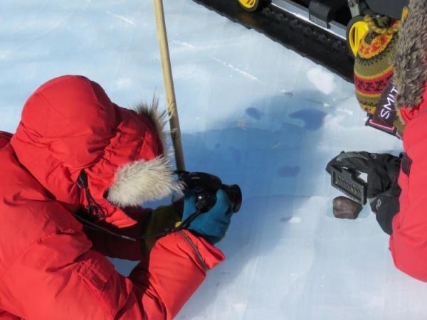 Image: Top: ANSMET researchers photograph an asteroid on the ice. (Credit: John McBrine)