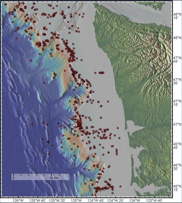 Image: Red stars show locations of methane bubble plumes off Washington's coast. The light gray is the shallow continental shelf, less than 160 meters (175 yards) deep. The blue is the deeper margin and abyssal plain, deeper than 2.8 kilometers (1.7 miles). (Credit: Paul Johnson/University of Washington)