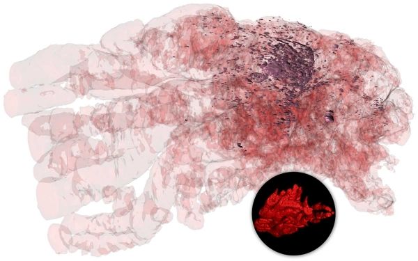 The imaging technique is called serial two-photon tomography (STPT). The two labs have used it to not only map in unprecedented detail the dense and complex structure that is a mouse prostate (inset image above, bottom right) but also to reveal the progression of the cancerous cells acting within (main image above).
