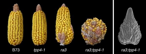 Image: Representative mature ears of genetically unaltered maize, maize with the tpp4 gene blocked, maize with the ra3 gene blocked and maize with both the ra3 and tpp4 genes blocked. Branching in the ear was observed when researchers blocked vital genes as compared to the normal unaltered maize.