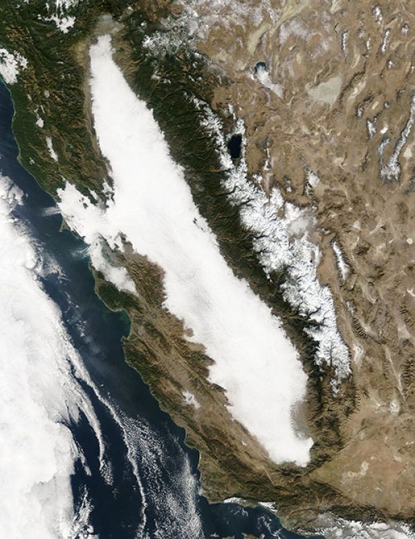 Photo: NASA’s Terra – MODIS satellite captures a thick blanket of fog covering California’s Central Valley. (NASA photo by Jeff Schmaltz)