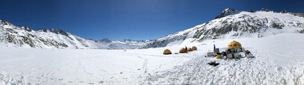 Photo: A true expedition: researchers' base camp on the Rhone glacier. (CREDITS: Institute of Geophysics / VAW / ETH Zurich)