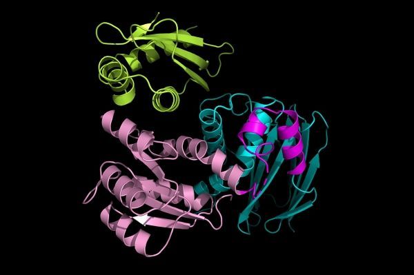 Image: A false-color structure of RssB (pink and cyan) — a protein that specifically recognizes a critical stress-response master regulator in bacteria and delivers it to the recycling machinery somewhat like a recycling truck — bound to IraD (green) — a factor that inhibits RssB activity. Both lobes of RssB, which are connected by a flexible linker (magenta) contact IraD in a “hug.” Image courtesy Alexandra Deaconescu.