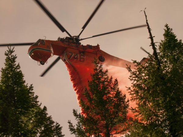 Photo: A fire helicopter drops flame retardant on a wildfire. Photo/Kari Greer/U.S. Forest Service