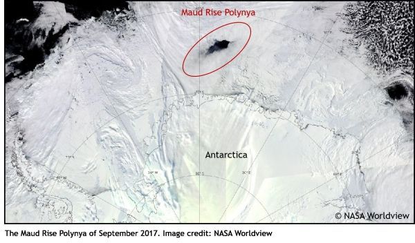 Caption: Satellite images of a polar cyclone (left) and the Maud Rise Polynya (right) in September 2017