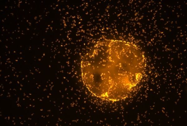 Image: Microscopic particles were immersed in natural seawater and examined underneath the microscope in order to observe the colonization dynamics of bacteria using genome sequencing. CREDIT: Julia Schwartzman