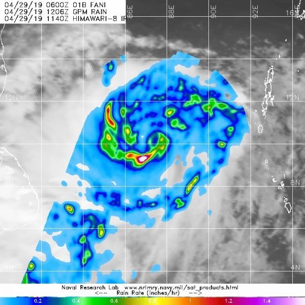 Tropical Storm Fani formed in the Northern Indian Ocean over the weekend of April 27 and 28. The Global Precipitation Measurement mission or GPM core satellite passed over the storm and measured rainfall occurring throughout the new storm.