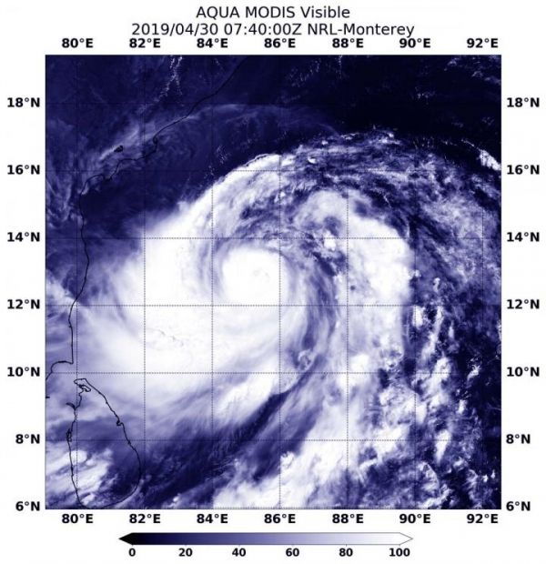 Image: On April 30, at 3:40 a.m. EDT (0740 UTC) the MODIS instrument aboard NASA's Aqua satellite provided a visible image of Tropical Cyclone Fani in the Northern Indian Ocean showing powerful thunderstorms around the center of circulation. (Credit: NASA/NRL)