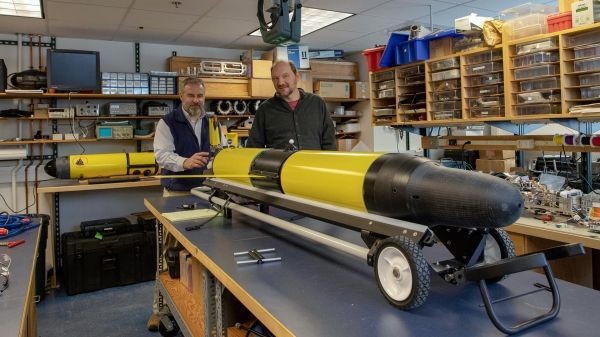 Photo: WHOI scientists Rich Camilli (left) and Ted Maksym are developing a new autonomous underwater vehicle (AUV) that will measure ice thickness from below the Arctic ocean surface for thousands of miles at a time, all with the power draw of a cell phone. (Photo by Jayne Doucette, Woods Hole Oceanographic Institution)