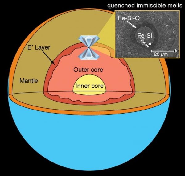 Image: A laser-heated diamond anvil cell is used to simulate the pressure and temperature conditions of Earth's core. Inset shows a scanning electron miscroscope image of a quenched melt spot with immiscible liquids. (Credit: Sarah M. Arveson/Yale University)