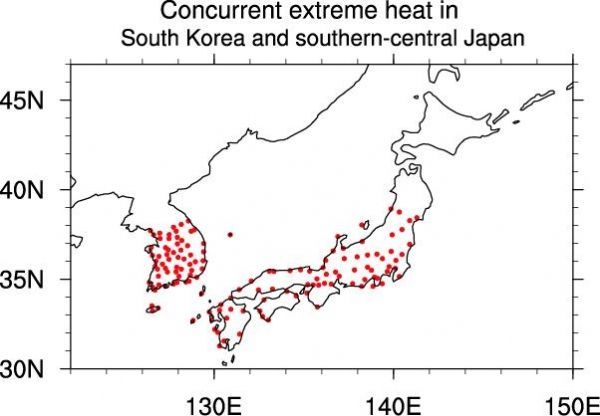Image: Concurrent extreme heat over South Korea and southern-central Japan. (Credit: Ruidan Chen)