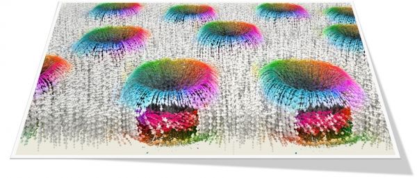 Photo: Army funded research discovery may allow for development of novel device structures that can be used to improve logic/memory, sensing, communications, and other applications for the Army as well as industry. Image demonstrates simulation of emergent chirality in polar skyrmions for the first time in oxide superlattices. (Photo Credit: Xiaoxing Cheng, Pennsylvania State University C.T. Nelson, Oak Ridge National Laboratory and Ramamoorthy Ramesh, University of California, Berkeley)