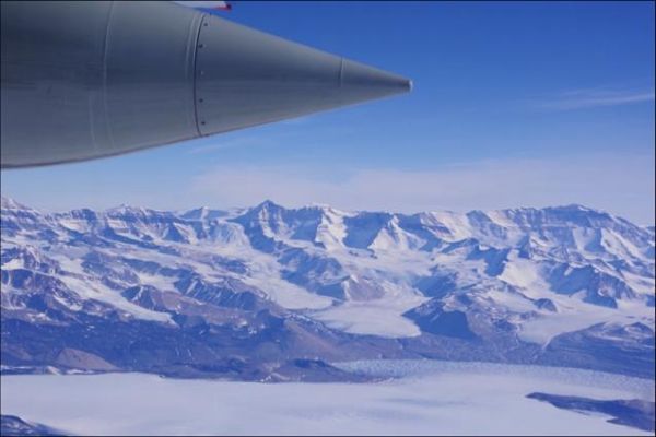 Image: Flying past the Transantarctic Mountains, which line the east side of the Ross Ice Shelf. (Credit: Susan Howard)
