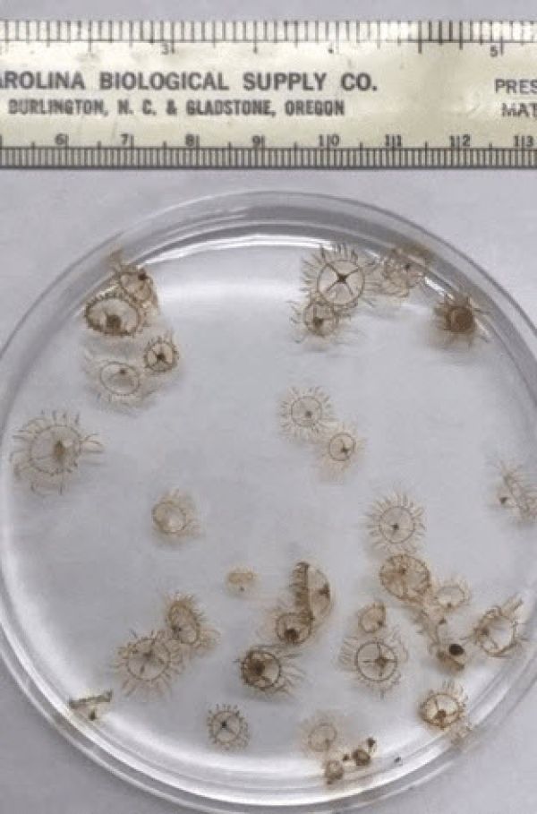 Image: Several young clinging jellyfish collected from Martha’s Vineyard swim in a petri dish. CREDIT: Annette Govindarajan, Woods Hole Oceanographic Institution