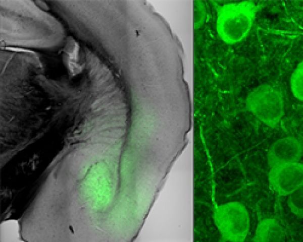Image: Deep brain imaging of basal amygdala neurons in freely moving mice – A: Anatomical overview with amygdala localization in the mouse brain. B: Individual amygdala neurons. CREDIT: Friedrich Miescher Institute. CREDIT: Friedrich Miescher Institute