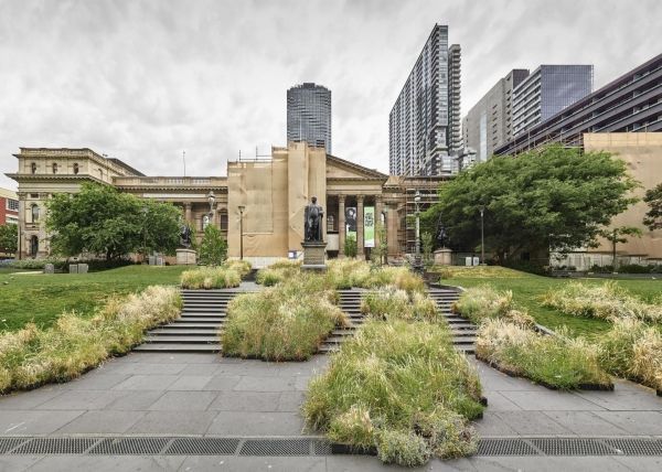 Image: The "Grasslands" Pop-up Park outside the State Library of Victory increased spider biodiversity at the site over six weeks. (Photo courtesy of Matthew Stanto.)