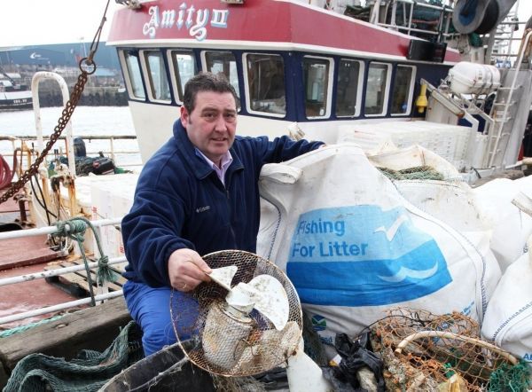 Image: Amity skipper Jimmy Buchan with some of the litter caught by his vessel. (Credit: Fishing for Litter)