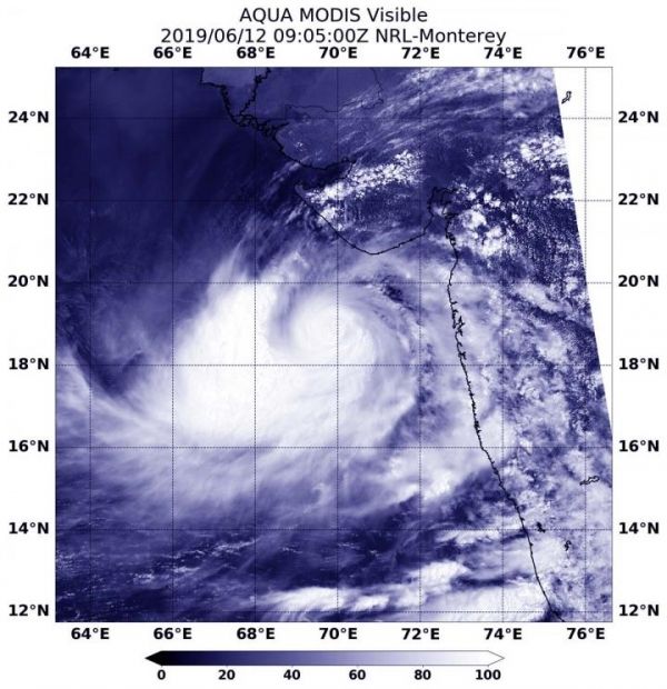Visible imagery from NASA’s Aqua satellite showed Tropical Cyclone Vayu has a compact central dense overcast cloud cover. Vayu’s center was off-shore from India’s Gujarart coast.