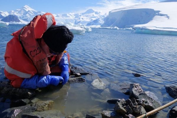 Image: John Spicer collecting intertidal amphipods from South Cove (Rothera Research Station, British Antarctic Survey) looking west to Ryder Bay on the Western Antarctic Peninsula. (Credit: Simon Morley)