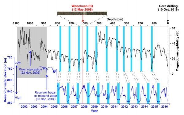 The Zipingpu Reservoir, with annually resolved sediments, provides a unique opportunity to document the link between a large earthquake and its sedimentary signature, because it was completed in September 2004 and is located downstream of the area impacted by the 2008 Wenchuan earthquake.