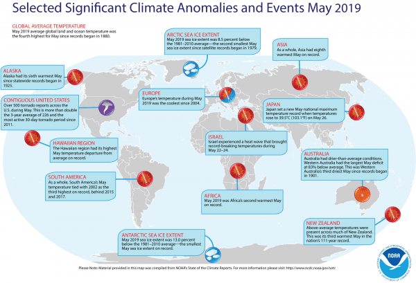 The average global temperature in May was 1.53 degrees F above the 20th-century average of 58.6 degrees F, making it the fourth-hottest May in the 140-year record (May 2016 ranking as hottest May to date), according to scientists at NOAA’s National Centers for Environmental Information. Last month was also the 43rd consecutive May and 413 consecutive month with above-average temperatures.